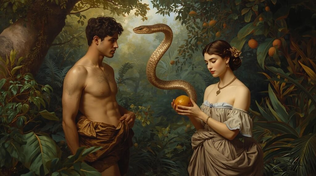 Eva, a primeira mulher, criada para ser a companheira de Adão é seduzida pela serpente, que a convence de comer o fruto da árvore da ciência do bem e do mal. Eva dá o fruto a Adão que também come. Os dois logo percebem sua nudez e se envergonham, descumprindo a única regra imposta por Deus para sua permanência no Jardim do Éden, fazendo com que os dois fossem expulsos.
