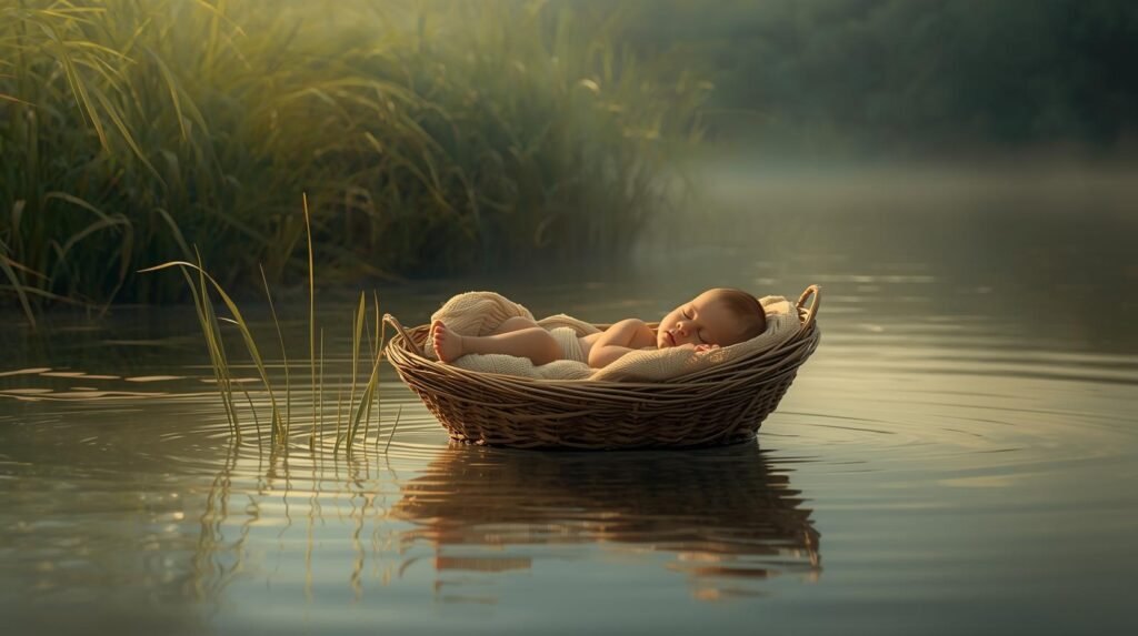- Utilizou uma cesta impermeabilizada para salvar seu filho — um gesto simbólico semelhante à arca de Noé, instrumento de preservação da vida.